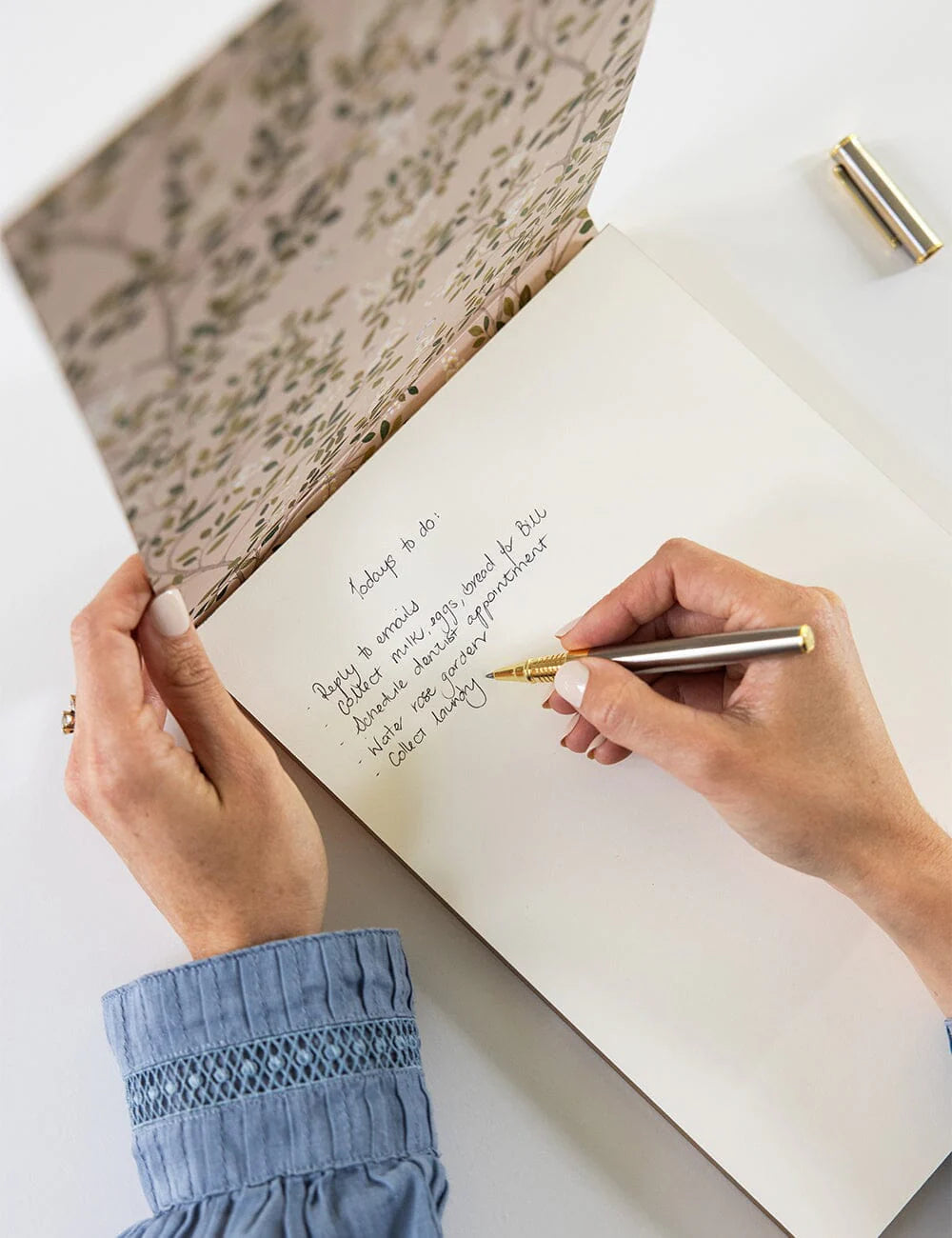 Illustrated by Bethany Linz, Featuring 100 heavyweight tear off blank pages. Bound with a gummed edge, and full heavyweight wrap around cover. Removable Gold Foil printed Bellyband and gold foil and gilded edges.